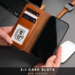 Toronata’s leather iPhone 15 Pro Max wallet case, your valuables are always close at hand and secure. The Casper wallet phone case by TORONATA is designed to fit the iPhone 15 Pro Max 6.7-inch model. It is an elegant, full-grain leather cover that blocks RFID signals and has card slots and a kickstand.