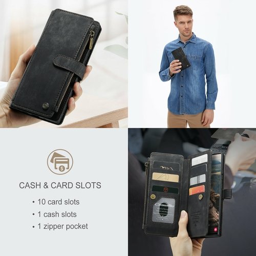 10 card slots, 1 cash slot and 1 zipper pocket.