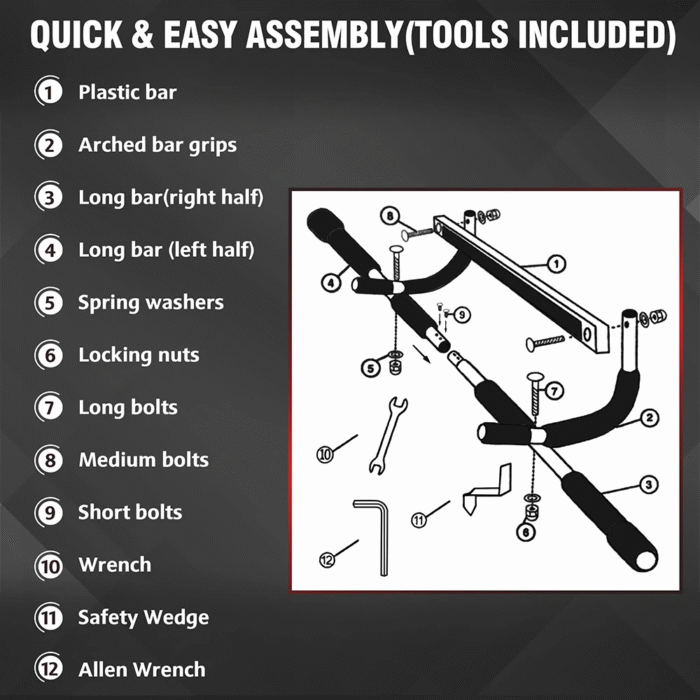 EASY TO INSTALL – The doorway pull up bar comes with an assembly manual and an assembly tool, so it will be easy to install and take away. The length of the doorway pull up bar is 36″, which fits any standard doorways width range from 23″to 31″, the depth of the door head jamb should be from 4.7″ to 7.5″. It is fixed on the door via a lever. No drilling is required, so it won’t damage the door. There are only screws for the product assembly but no damage to the doorway.